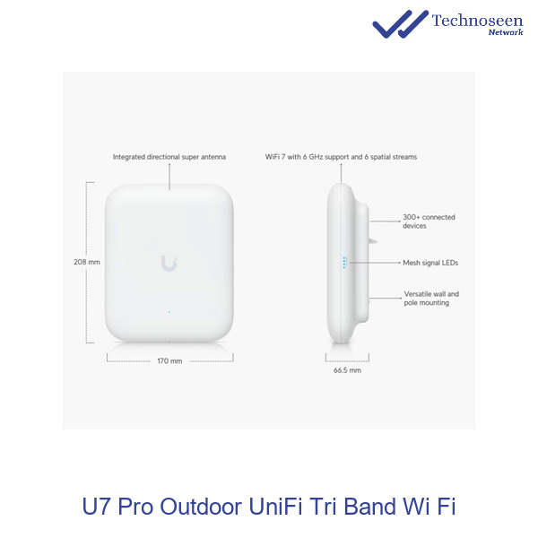 اکسس پوینت یوبیکیوتی U7 Pro Outdoor یونیفای پرچمدار جدید یوبیکیوتی در حوزه تجهیزات وایرلس فضای باز است که با هدف ارائه بالاترین سطح عملکرد و پایداری در سختترین شرایط محیطی عرضه شده است. این دستگاه، تمام ویژگیهای پیشرفته Wi-Fi 7 را با یک محفظه مقاوم در برابر آب و گرد و غبار (با رتبه IP67 با کیت درپوش کابل) ترکیب کرده و برای نصب بر روی دیوار یا میله در فضای باز طراحی شده است.